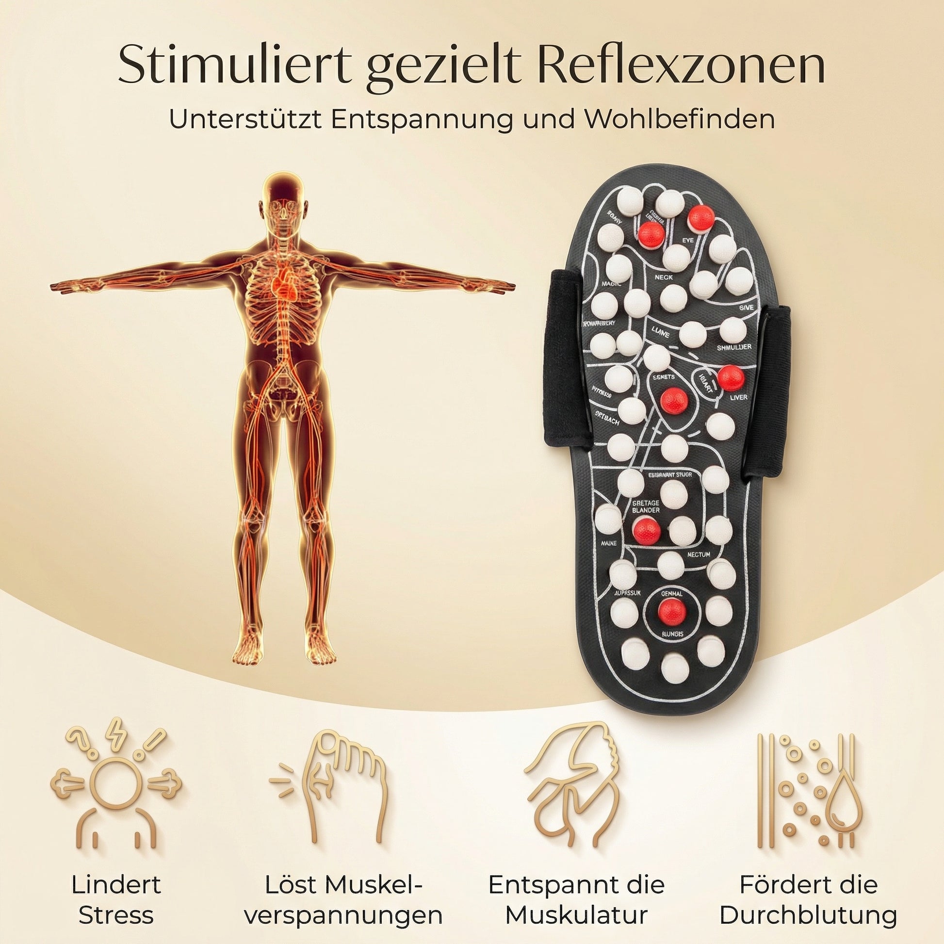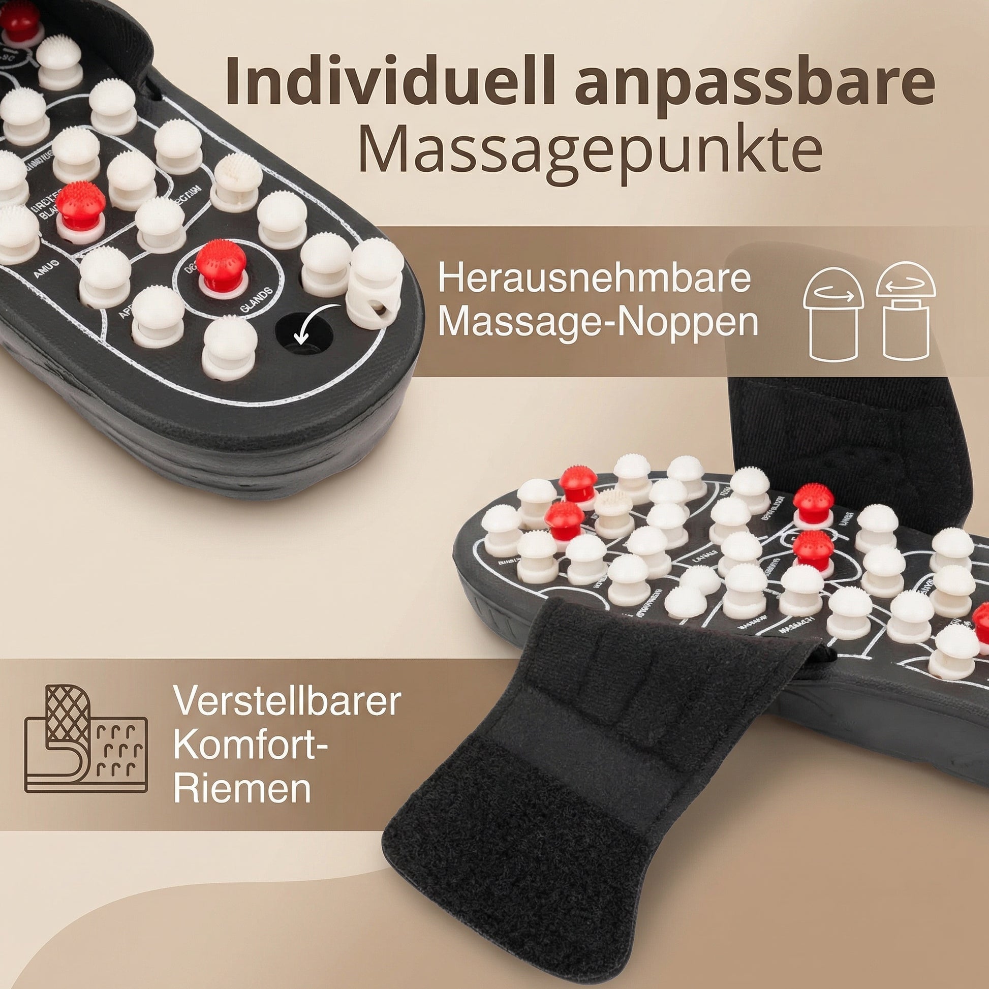 Durch gezielte Druckpunkte stimulieren die Sandalen deine Fußreflexzonen und sorgen für eine natürliche Aktivierung der Durchblutung. Die Anwendung ist einfach: anziehen und den Effekt direkt spüren.